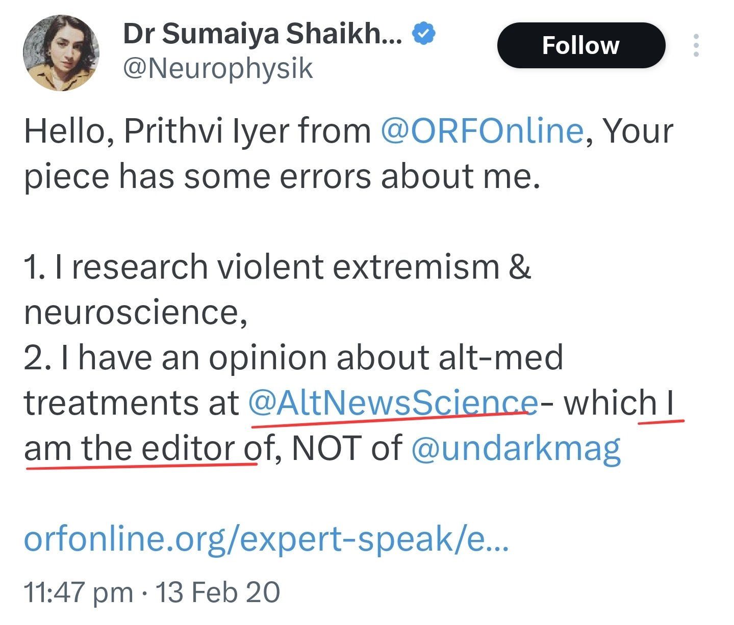 However, as per the author page of Dr Shaikh on Alt News’s website, she was not a mere contributor but the Founding-Editor for Alt News Science, from the year 2017 to 2021. “Alt News Science is no longer edited by Dr. Sumaiya Shaikh. From 2017 to 2021, Dr. Shaikh was the Founding Editor for Alt News Science. Her main role is as a neuroscientist researching violent extremism and psychiatry,” Shaikh’s Alt News author page reads.